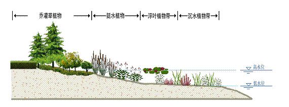 生态护岸技术以滨水生态缓冲带结构和功能为依据,以透水性护岸材料的使用为手段,改善传统硬质不透水护岸对于水体横向连通性阻断影响。以护岸为基线,结合滨水湿生植物群落和陆生植物群落的合理配置和恢复,在沿河带状空间内,构建具有面源污染物拦截净化作用生态廊道,并达到一定的景观效果。